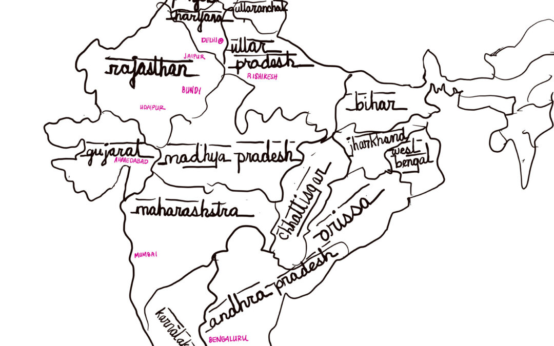 I have drawn several versions of this map to familiarize myself with the states and the cities we plan to visit in India. The mauve color is showing the various cities we plan to travel to, starting in Delhi. Each time I post, I will zoom into the area we are currently in and, of course, give you other visuals to enjoy.